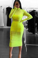 This Mesh Lime Green Dress is the perfect statement piece for any fashion-forward individual. The dress features a bold neon lime green color that is sure to turn heads. The mesh material adds a unique, see-through element to the dress while the ruched detailing adds texture and dimension. The dress has long sleeves that are designed with thumbholes, and a turtleneck collar for a sleek, modern look. The dress comes in a 3-piece set, including a crop tank top and high-waisted shorts, both in the same stretchy, bodycon material as the dress. The set is perfect for a night out or a special event, as it is sure to make you stand out in a crowd. The dress is made from stretchy material that will hug your curves in all the right places. Add this dress to your wardrobe for a bold, trendy look that is sure to impress.